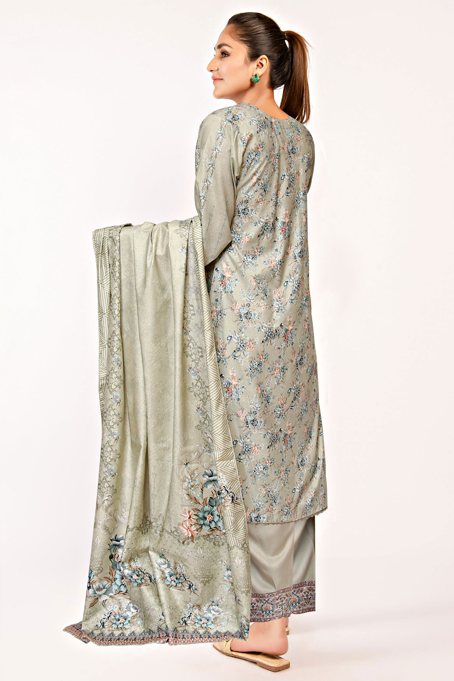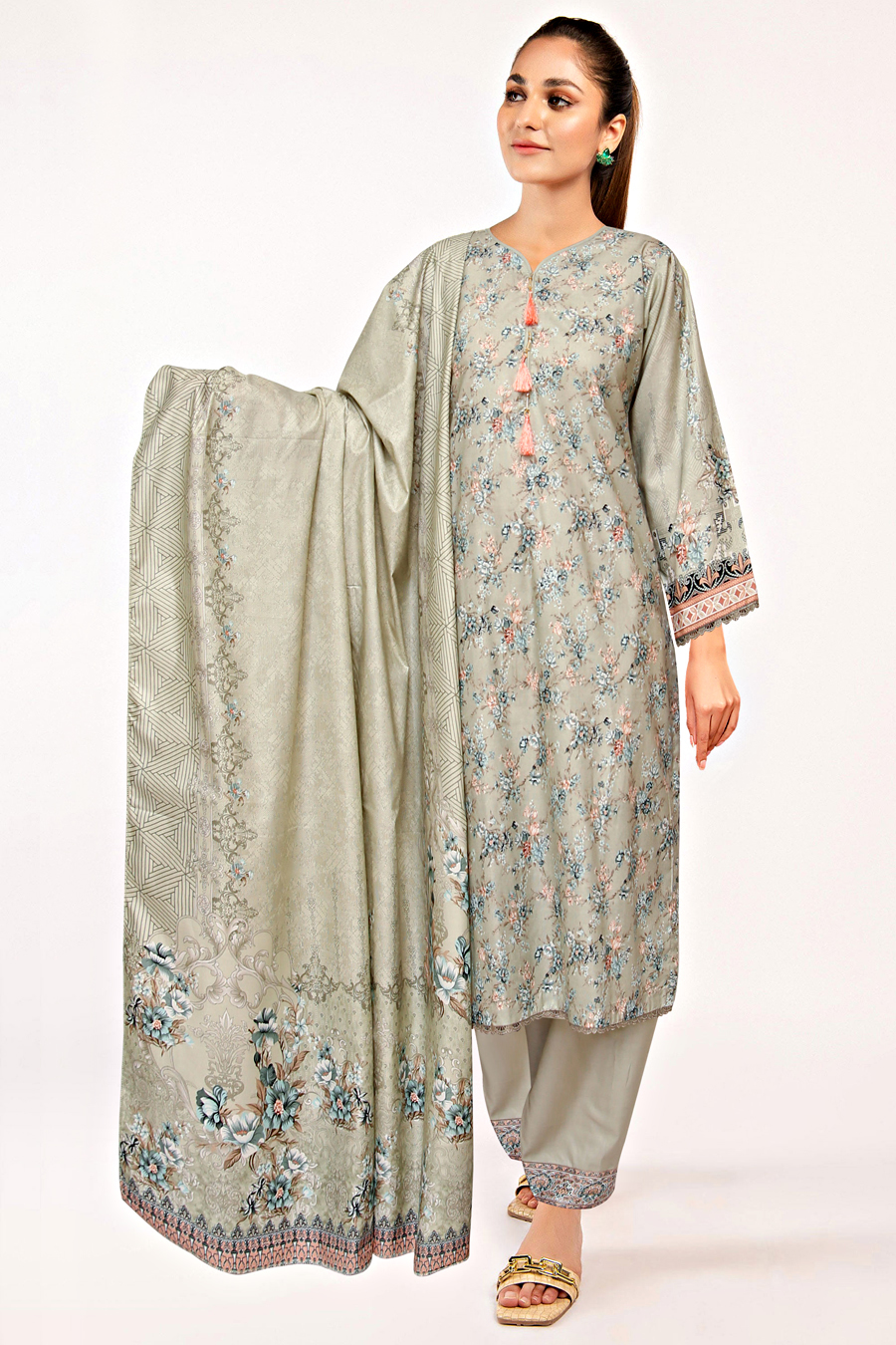 THIS DIGITAL PRINTED LINEN ARTICLE IS EMBALISHED WITH LACE ON SHIRT BOTTOM FRONT/BACK AND SLEEVES. BUTTONS ON NECKLINE. PLANE DYED LINEN SHALWAR WITH PRINTED BORDER AND PRINTED DUPATTA. Discover elegance in every detail with our Pakistani Linen Trouser Suit. This digital printed ensemble is adorned with lace on the shirt's bottom front, back, and sleeves, featuring buttons on the neckline for added charm. The dyed linen loose bottom trousers boast a printed border on the edge.